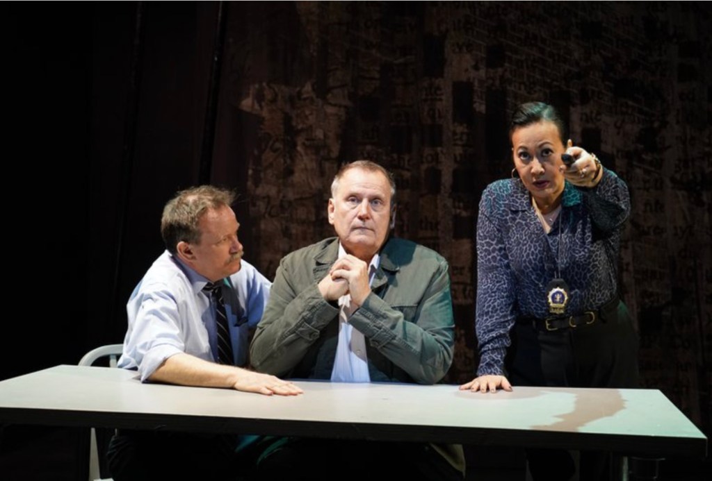Director Margarett Perry has chosen to lean into the broader strokes of the script rather than refining them. This has the effect of further emphasizing McAlester’s exceptional world view and meticulous attention to detail. While all of the actors skillfully handle the quick changes, there is an imprecision to the technical cues that would likely drive McAlester around the bend. Jen Leno lighting, which is designed to switch seamlessly between harshly lit offices and the more subtle glow of city streets, is diminished by off-target spots. Set designer Tyler M. Perry’s black and white cityscape with its swirl of letters and scribbles is distracting to anyone attempting to decipher it. The askew poles and tumble of chairs — perhaps metaphors for seeing events from different angles — work better in support of the action. Daniel Lawson’s costumes, primarily an array of “uniforms” of the trades, also help to move things along with identifiable shorthand.