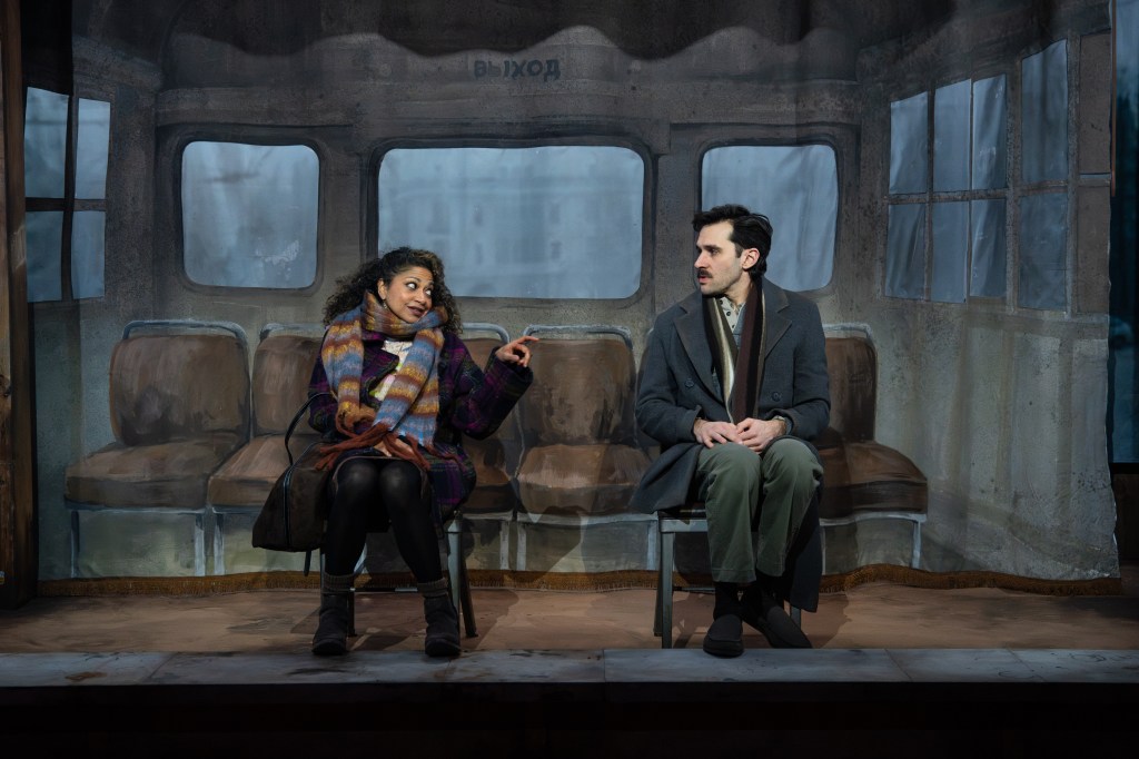 Wildly praised prior to the pandemic — particularly for Cambodian Rock Band which inventively explored the terror of the Khmer Rouge using a father/daughter story with music — Lauren Yee is currently a playwright in residence at the SignatureTheatre. Her pen and tongue are still sharp, though she seems in a more fun-loving mood this time around. Lines are written in colloquial English but with Russian construction. Teddy Bergman’s playful direction enriches the slender script. The prolific and visionary scenic design team of dots plays up the conflicting worlds of artifice and factuality that run throughout its pages. The central portion of the set has a detailed commercialized frame and a defaced rolling metal door that is often used for emphasis. Fancifully painted curtains complete the look of a city bus and Evgeny’s family home. This two-pronged motif is continued with Jon Knust cunning props. Sound designer Mikhail Fiksel makes terrific use of a wide range of music
