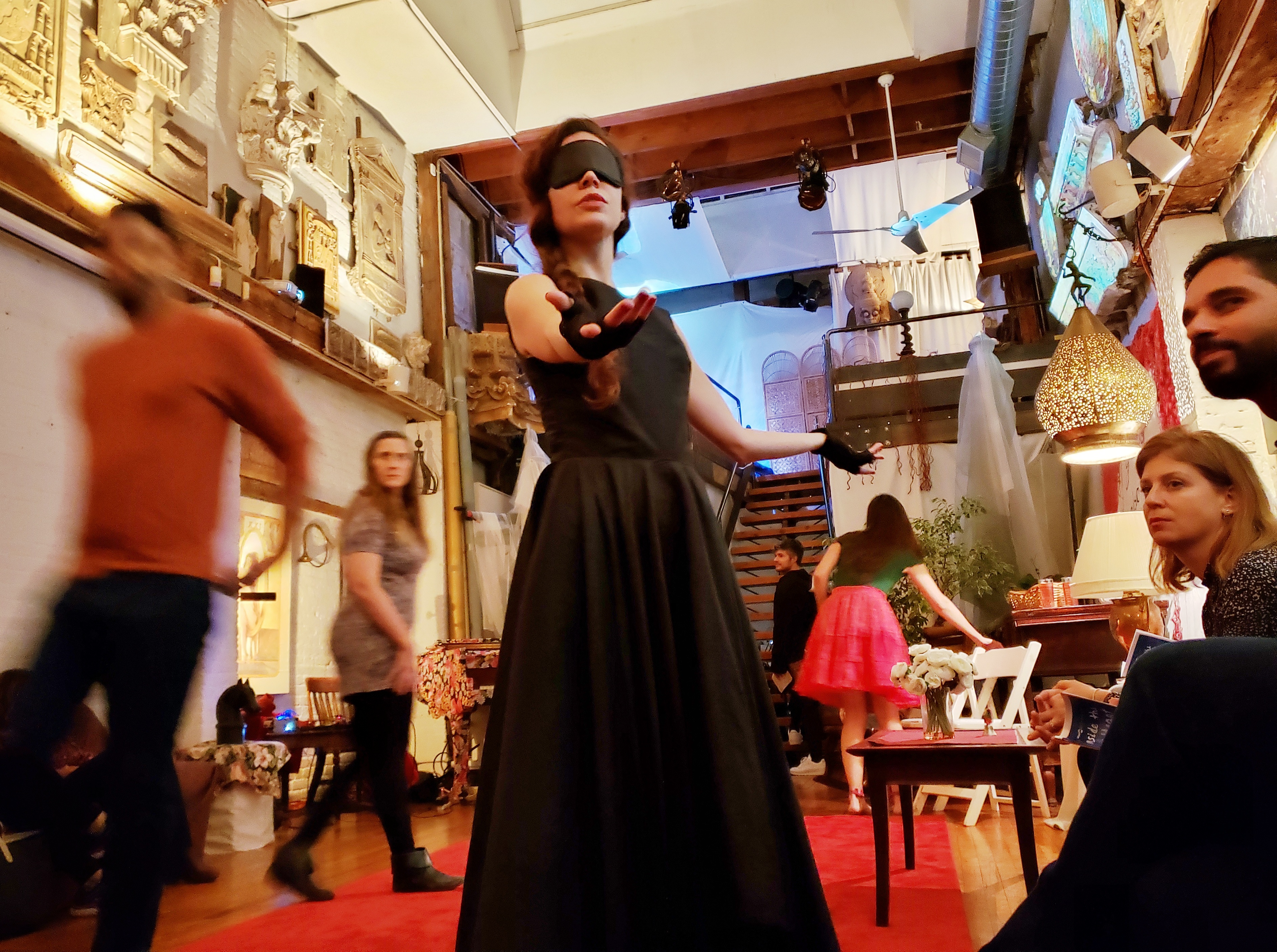 Dominating the event is a filmed version of the 2018 production adapted for the stage by Andressa Furletti and Debora Balardini and directed by Linda Wise. The streaming version runs simultaneously on all floors represented in the gather.town “house” just as it did live. The rooms were obviously small and crowded with audience members perched on the furniture and stairways. This results in awkward camera angles and poor sound quality further muffled by Sergio Krakowski discordant score performed by violinist Mario Forte. The script — like Lispector’s novels — is more about feeling than narrative and it is possible to sense the underlying emotions and wild shifts in tone despite the technical limitations. The expressive cast includes Debora Balardini, Mirko Faienza, Patricia Faolli, Andressa Furletti, Fabiana Mattedi, Gio Mielle, Gonçalo Ruivo, Yasmin Santana, Ibsen Santos, and Montserrat Vargas. Vargas’s and Furletti’s production design such as the flowered wallpaper with eyes and a globe lamp used to see the future manages to shine through.