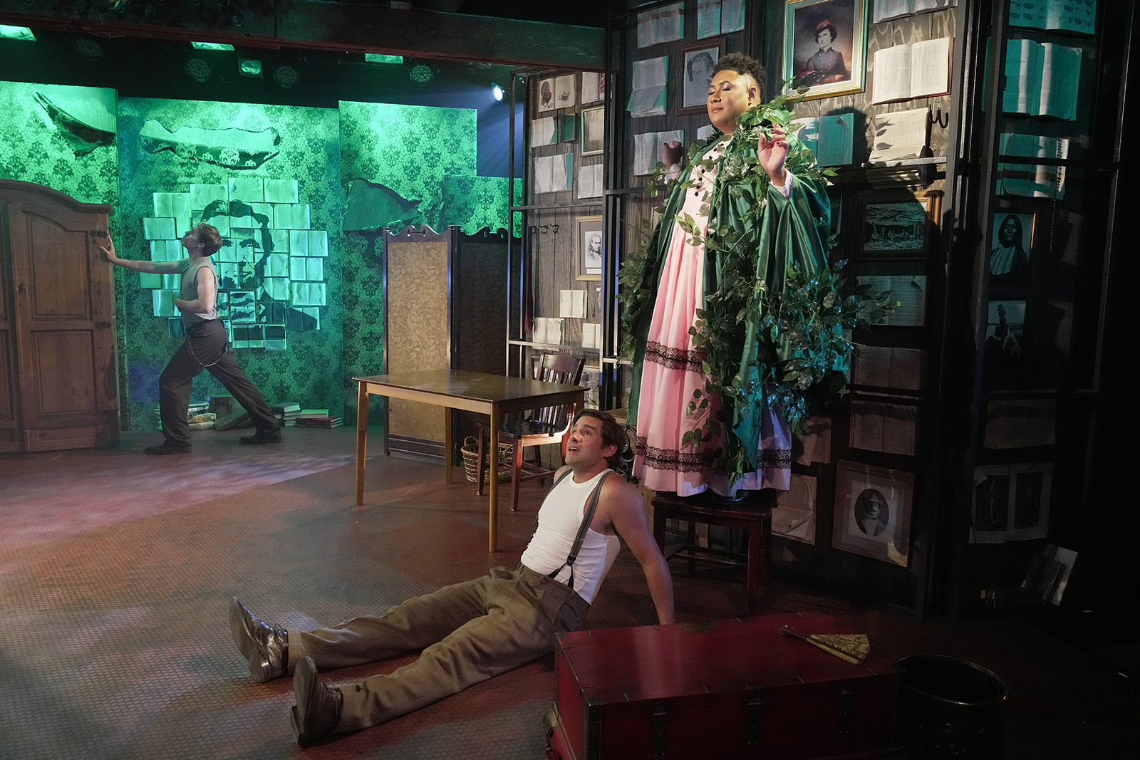Swirling in Wendell Carmichael’s glorious skirts and bonnets, playwright Mason portrays their unique creation, Taffeta, as bold yet self critical, wise, but with lessons to learn. The chemistry between Pete Ploszek’s Abe and Alex Esola’s Elmer is electric. The two maintain connection as they move through time — now, then and never — while manage Taffeta’s coaxing, interfering, and micromanagement. This renders the tightly choreographed slo-mo love scene superfluous and, with Taffeta as a witness, cheapens what had felt genuine.