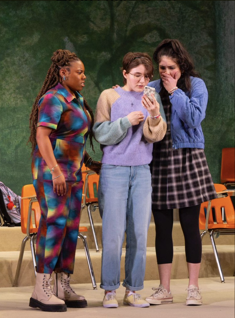 Seasoned director Margot Bordelon, who has a history of amplifying new voices, seems to have deep love for these characters, bringing out every delicate moment of discomfort and rage with authenticity. The school room’s simple set by Kristen Robinson changes temperament with the help of Aja M. Jackson’s lighting. Sound designer Sinan Refik mixes snippets of pop tunes with school bells and eery noises to further shift the tone of the room. The girls also make themselves heard in their choice of wardrobe (Zoë Sundra) and in Raelynn’s case evolving eye make-up.