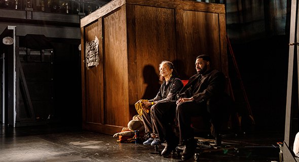 Image: Ito Aghayere, Sahr Ngaujah and Kevin Mambo in the 2018 World Premiere of Mlima’s Tale. © Joan Marcus.