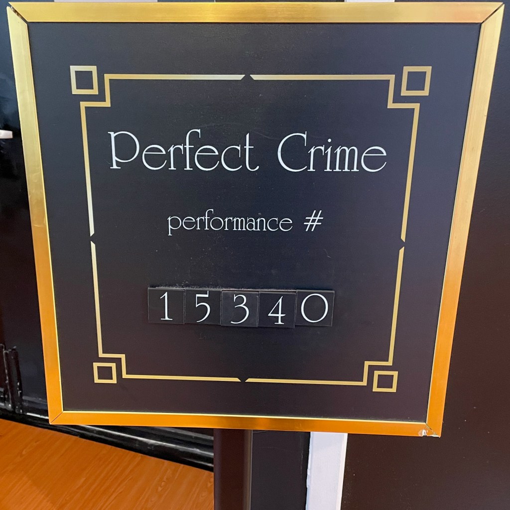 The viewing experience begins cleverly enough.  The comfortable lobby centers on a massive mugshot board with a bucket of props beside it for taking selfies.  Tips for committing the perfect crime are hung on the the pillars around a welcoming bar offering an array of theme cocktails.  The producers have thoughtfully paid for Wordly, a translation and caption service that can provide the play’s dialogue in a number of languages.
