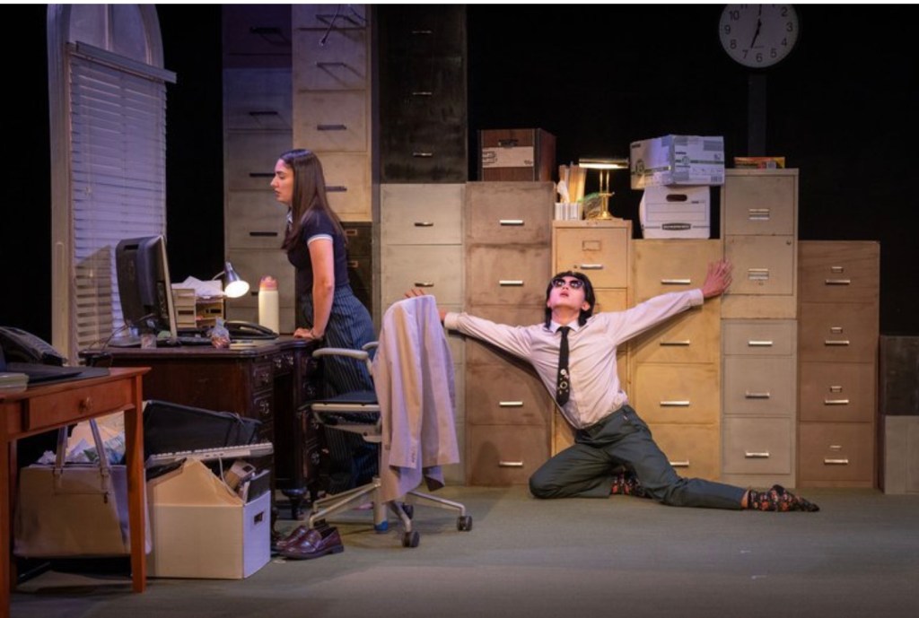 Scenic designer Daniel Allen sets the scene within an off-kilter office. To serve the direction, file cabinets are piled across the back in a staircase formation and the third desk floats chairless mid-stage. Within these strange walls are the interns for Senator Bachmann whose vote will determine the fate of a critical healthcare funding bill. Rudderless and crippled by anxiety is recent college grad Emi (Kleo Mitrokostas). One year younger, Tip (Charles Hsu) is four times more interested in influencing the world through his monologues than within the bureaucratic structure. Their supervisor is former intern Kaz (Vann Dukes), a non-binary pragmatist with political ambitions of their own. The three have been receiving regular calls from Stevie (Susan Lynskey), whose pleas to speak with the Senator have grown increasingly frequent and agitated.